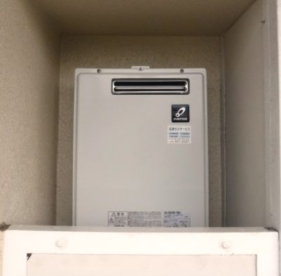 台風の影響で給湯器本体が水に浸かってしまい、お湯が出なくなってしまったとのことで、パーパスのガスふろ給湯器へと新しくお取替えいたしました。