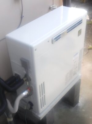 パーパスの屋外据置型(隣接設置)のガスふろ給湯器へお取替えしました。